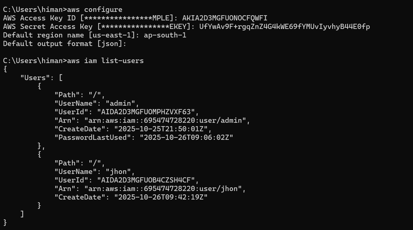 • Generate keys in the AWS Management Console → IAM → Users → Security Credentials → Create Access Key.