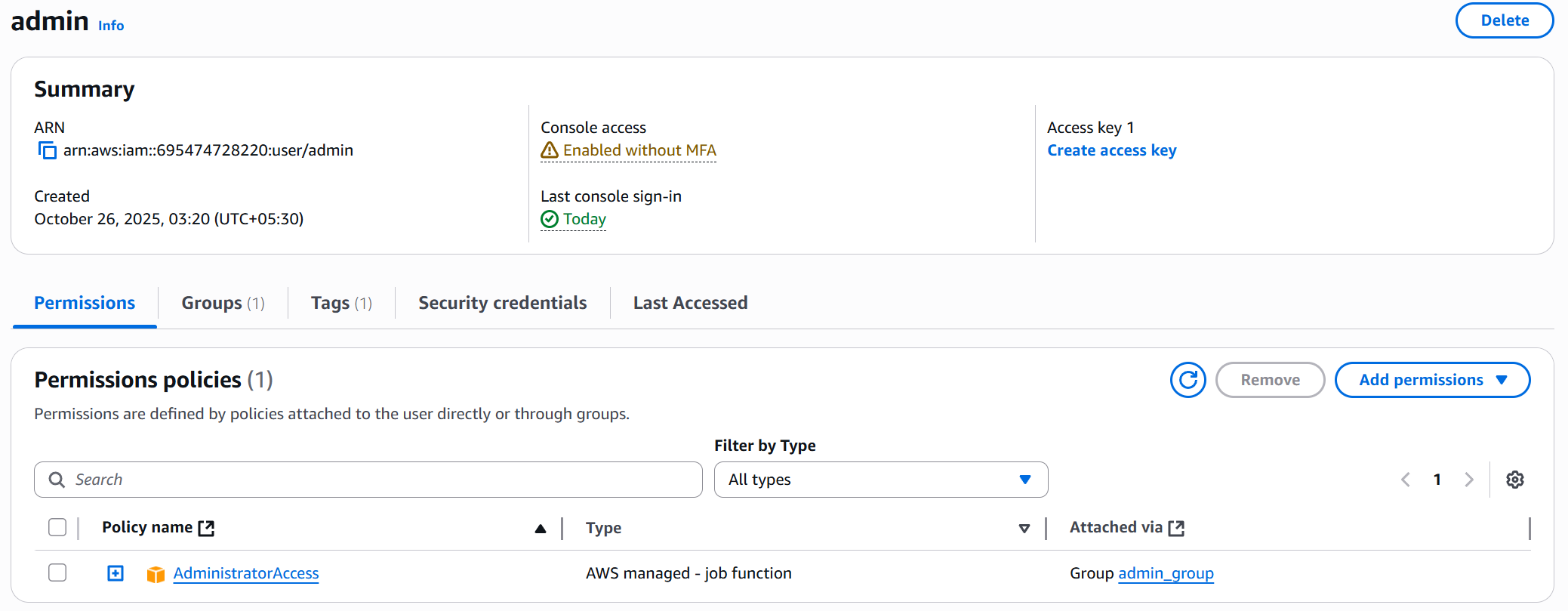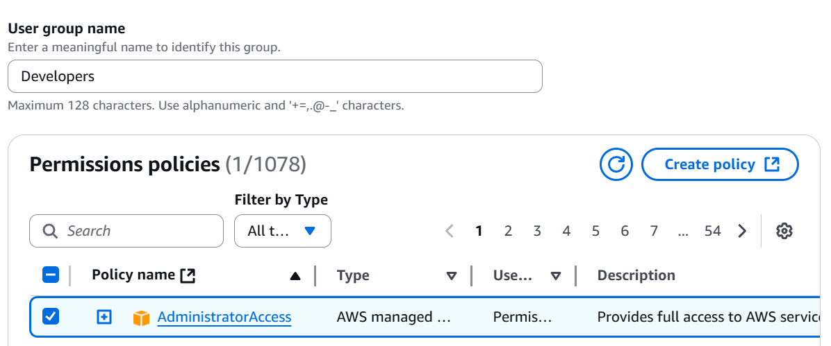 1. Add user to a group — attach predefined policies to a group.